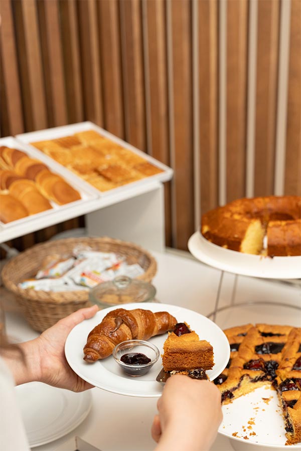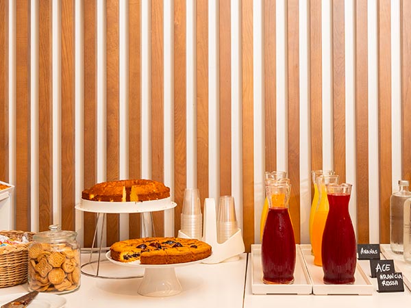 Coffee, cappuccino, caffe latte with fresh milk and freshly ground coffee, barley, ginseng, hot chocolate, tea, and herbal teas, along with plant-based drinks, fruit juices, and freshly squeezed orange juice, complete the table.