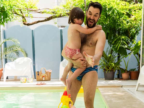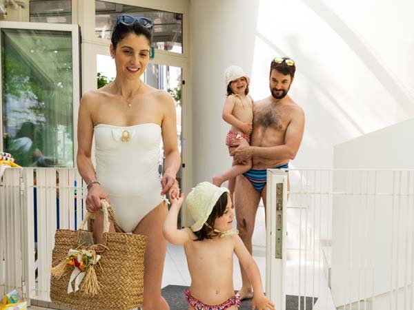 The pool is a happy space: a shallow area designed for children, splashes, dives, and laughter that make even their eyes light up.