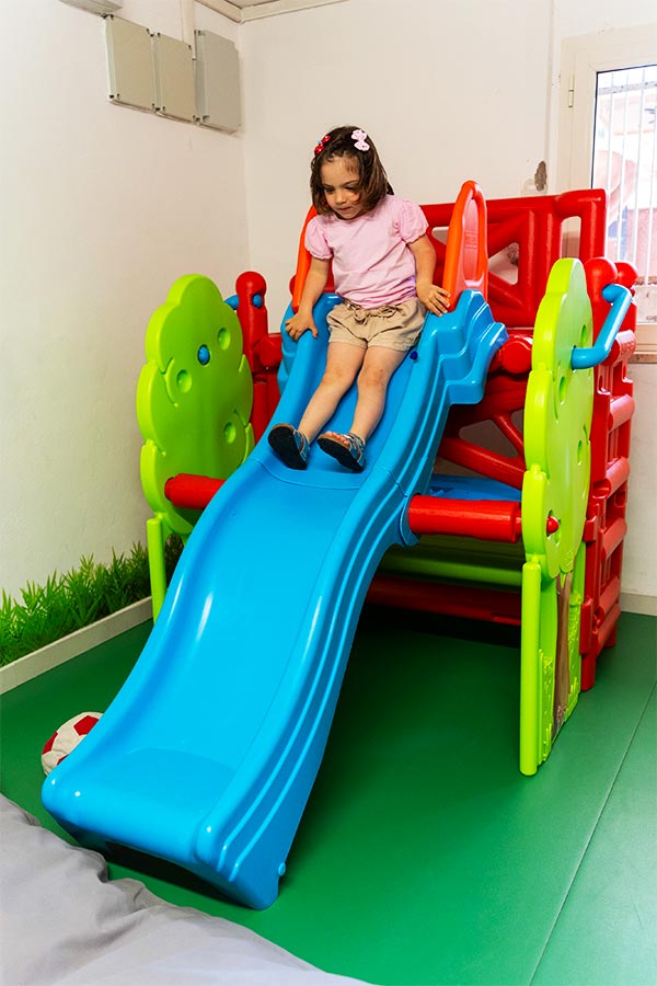 The indoor play area is welcoming and full of stimulation: games to share, bright colors to draw with, fun books, and table football challenges that quickly become friendships.